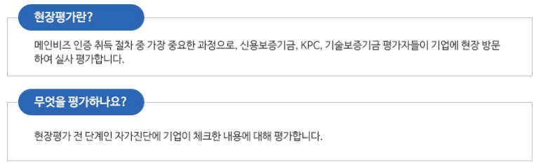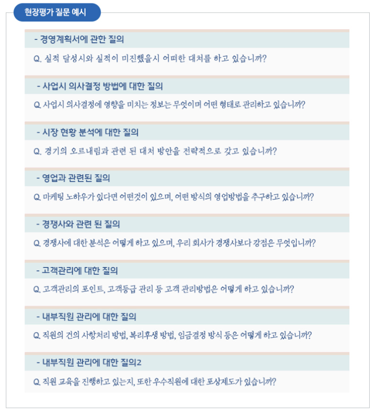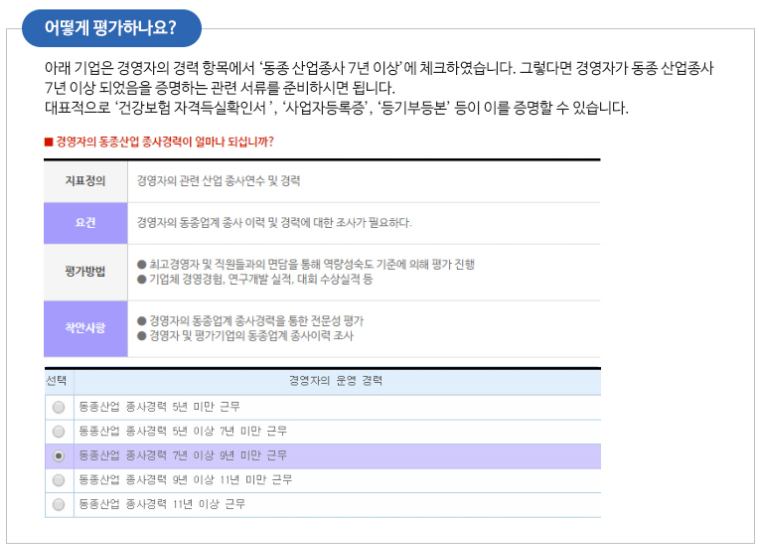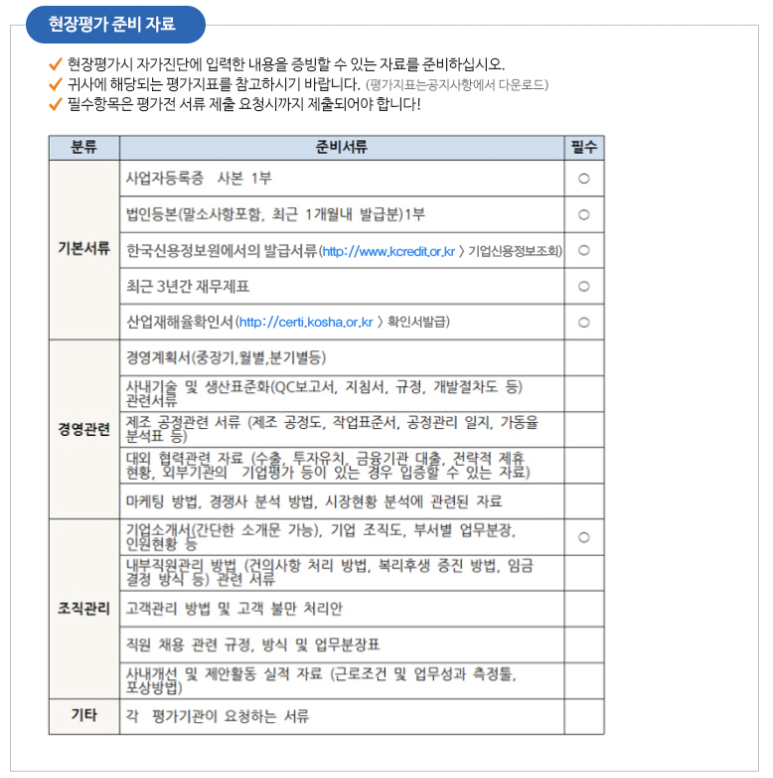 - 평가기관 : 신용보증기금, 기술보증기금, 한국생산성본부
