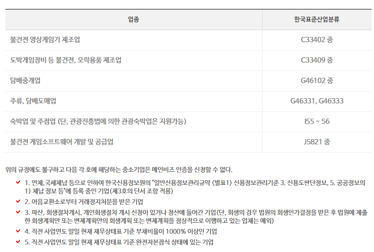 다만, 게임 도박, 사행성, 불건전 소비업중에 해당하는 다음 각호의 어느 하나에 해당되는 기업은 제외한다!