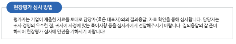 - 평가방법 : 신청기업의 현장을 방문하여 '경영혁신형 중소기업 평가지표'에 따라 평가실시