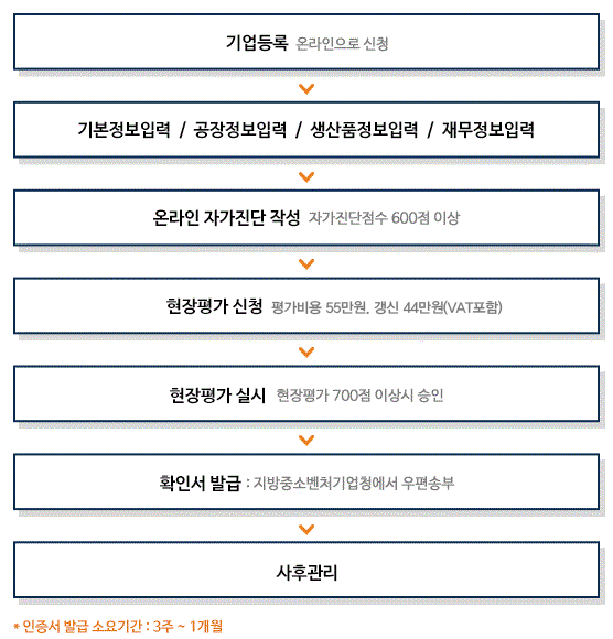 신청방법 : 확인을 받고자 하는 중소기업이 온라인을 통해 기업정보, 사업정보, 재무정보 등 기본사항을 입력하고 신청