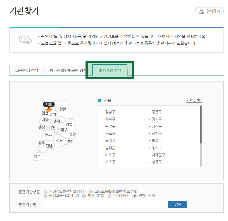 훈련기관 및 고용센터 기관찾기 -> 기관검색